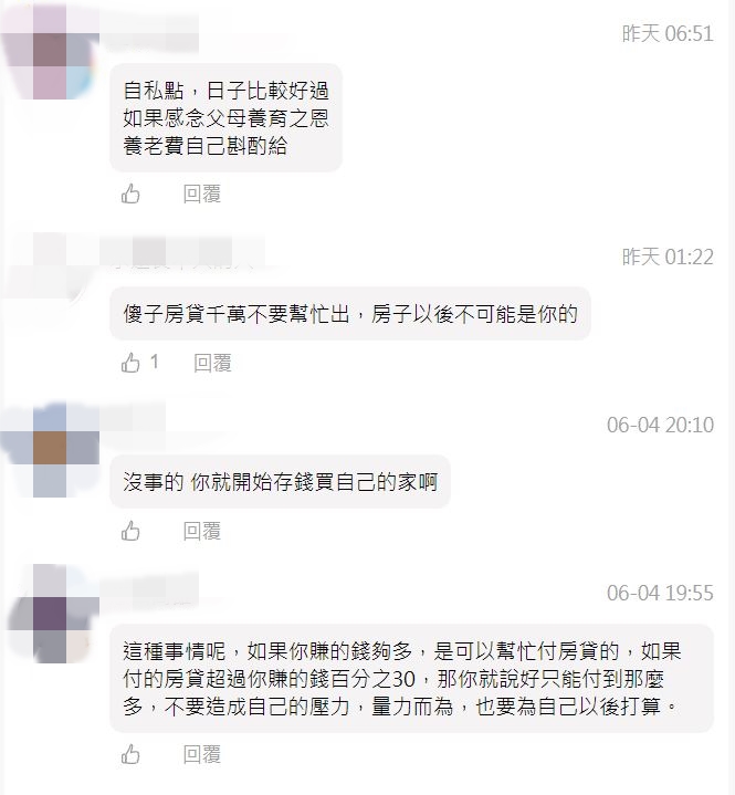 也有網友給出建議:「有時候人就是要自私點,既然他們沒有考慮過妳,妳不如把錢存著自己用。」、「從現在開始把幫忙繳房貸的錢,留給自己買房繳房貸用!」、「以後自己買一間房子,再也不用看家裡的臉色。」、「從現在起別再一昧付出,多為自己著想!」
