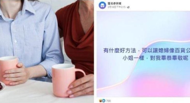 一位婆婆提問:「有什麼好方法,可以讓媳婦像百貨公司的專櫃小姐,對我畢恭畢敬呢?」 # 網友狂推一招 extDrive快訊廣告 女人何苦為難女人?在傳統長輩眼中,媳婦娶回來就該乖巧順從、好好聽話,如果違背他們的意思,就會被冠上「不孝」罪名…因此,婆媳問題讓不少人感到頭痛。 NativeDrive原生廣告