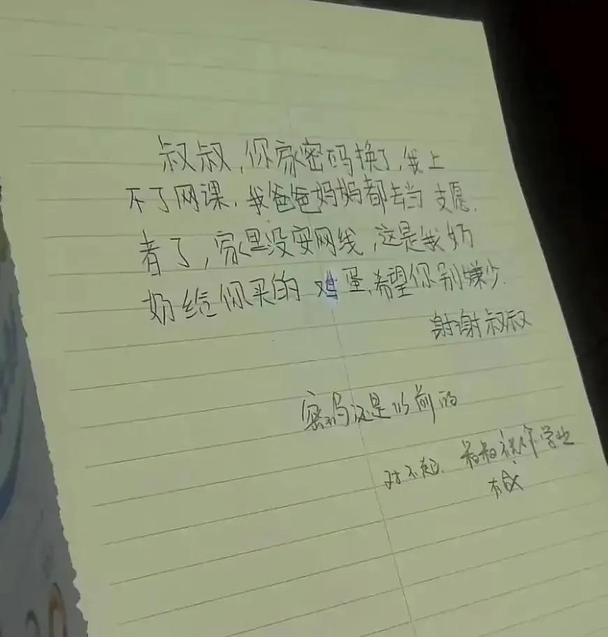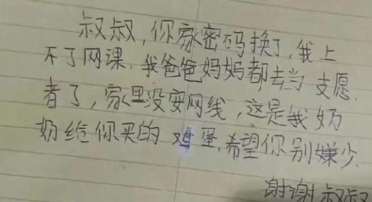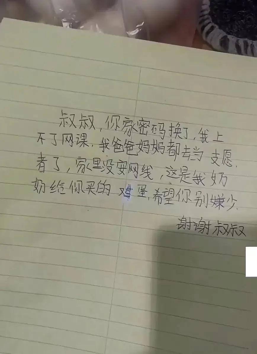 原來孩子的爸媽都去當志願者了,沒人在家無法安裝網路線,只好繼續拜託他,特地在地上放了一袋雞蛋,小心翼翼寫著:「這是我奶奶給你買的雞蛋,希望你別嫌少,謝謝叔叔!」