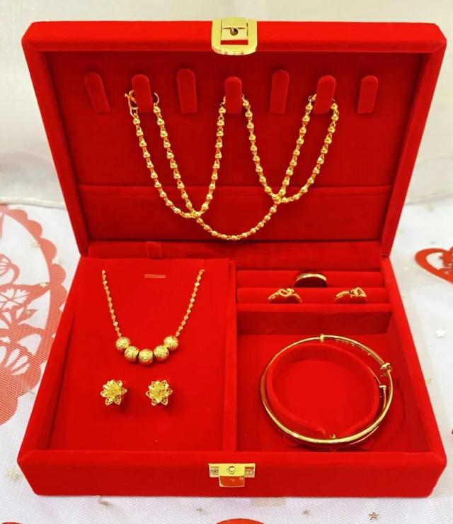 這套首飾是我給你堂弟媳婦買三金的時候相中的,我覺得很適合你戴,就給你買下來了。不許退回來,也不許客氣。我們就生了你堂弟一個臭小子,老了還指望你這個小棉襖照顧呢。